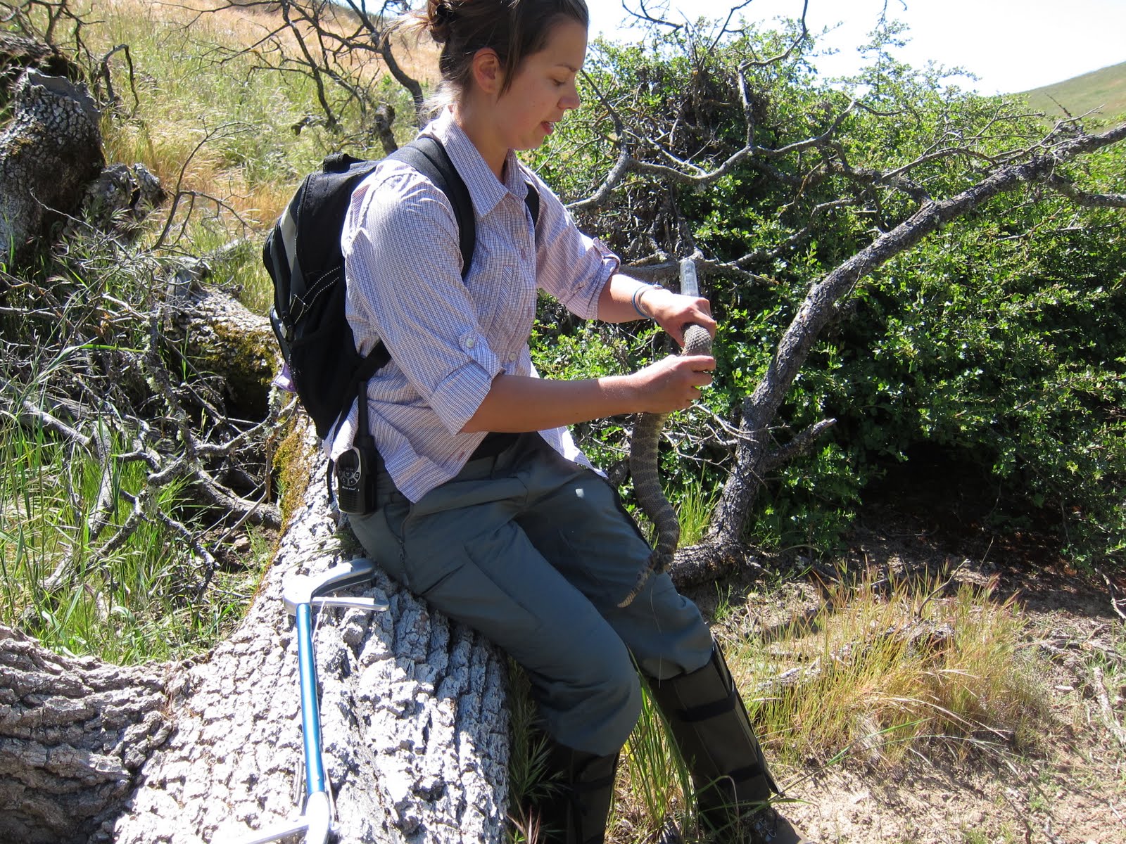 Tracking a snake we released with a radio transmitter on it. The antenna that I am carrying picks up its specific radio frequency creating pulses that become louder as one approaches the snake.